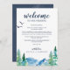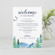 Ces cartes d'accueil et d'itinéraire mariage Rocky Mountain sont parfaites pour un mariage extérieur. Le design comprend un paysage sauvage peint en bleu et vert avec des pins d'aquarelle, des oiseaux et des montagnes. Le recto de la carte comporte une lettre de bienvenue et le verso de la carte indique l'itinéraire du mariage. Ces notes sont parfaites pour les mariages de destination et les sacs de bienvenue des clients de l'hôtel.