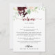 Cette simple lettre d'accueil mariage classique et colorée est parfaite pour un mariage rustique. Le design se compose de fleurs d'aquarelle bordeaux, roses, rousses et blanches, de feuilles verts et de baies rouges soigneusement groupées en bouquets attrayants. Personnalisez le devant avec un message de bienvenue pour vos invités et vos noms. Personnalisez le dos avec le calendrier des événements et autres informations utiles.