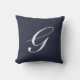 coussin monogramme personnalisé avec une lettre d'écriture classique G sur un arrière - plan bleu Navy. Fabriqué aux États-Unis à partir de coton ou de polyester lavables à la machine. Parfait pour Gladys, Graciela, Gretchen, Georgia, Giselle, Genevieve, Gianna, Gloria, Genesis, Gina, Gabriela, Gabriella, Gabrielle, Grace ou toute autre personne qui s'appelle commence par la lettre G.