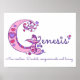 Joli monogramme G art avec nom et explication, affiche parfaite pour la chambre ou la salle de jeux d'une fille dans des tons de blanc, rose et violet. Personnalisez avec le nom de votre enfant commençant par G, et la signification du nom pour un effet vraiment personnalisé dans la chambre ou la nurserie de votre enfant, cet exemple est pour le nom Genesis Nouvelle création. Dévoué, compatissant et aimant. Jolie affiche idéale pour un nouveau-né, un baptême ou un cadeau de baby shower. © Unique monogramme G avec cœurs et fleurs, description et conception graphique de Sarah Trett. www.sarahtrett.com pour www.mylittleeden.com