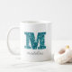 Ce mug girly a un M initial monogramme dans un motif de parties scintillant bleu aqua et est personnalisé avec votre nom sous un script gris.