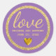 Les autocollants de faveur de mariage commencent par un violet profond. Un cercle rond de parties scintillant dorée forme un cadre autour du bord. A l'intérieur du cadre de la parties scintillant dorée, l'amour est écrit en grandes lettres dans une police moderne. Les noms des mariés et des mariés et leur date de mariage sont en dessous du mot amour. Un coeur d'or est en dessous du texte.