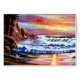 Peinture d'une plage à l'aube avec vagues et mouettes cassantes contre un ciel coloré rose et orange.