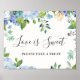 Bienvenue invités à votre mariage avec Light Blue Hydrangea Love is Sweet Poster, avec une verdure botanique d'aquarelle luxuriante et des fleurs blanches, avec "bienvenue à notre heureux toujours après", vos noms, et date mariage dans un mélange chic de bloc moderne et de caractères calligraphie lettrés à la main.
