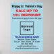 Affiche bleu clair pour la Saint Patrick que vous pouvez customiser en indiquant le pourcentage de remise, les dates de vente, télécharger votre logo d'entreprise, taper votre nom d'entreprise, adresse, numéro de téléphone, courriel et site Web. Customisez-le et affichez-le pour attirer plus de clients pour acheter vos produits ou clients pour aimer vos services. Veuillez vérifier l'apparence après avoir téléchargé le logo et tapé des textes. Si l'apparence vous plaît, vous pouvez passer votre commande maintenant. Si vous avez besoin de redimensionner et repositionner le logo et les textes pour les mettre sur cette affiche ou sur la taille et le style que vous avez choisi, s'il vous plaît ajuster dans l'outil de conception. Vous pouvez également modifier la couleur arrière - plan, la couleur de police et le style de police dans l'outil de conception. Bonne Saint Patrick ! Je vous souhaite le meilleur de la chance, de la joie et plus de ventes ce jour férié.