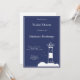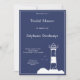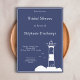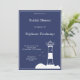 Elégante et simple invitation à la douche nuptiale bleu marine avec une illustration d'un phare pour un mariage marin et nautique à thème !