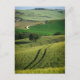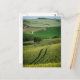 Carte postale d'un paysage presque abstrait avec des lignes vertes courbées dans les champs d'orge entre Pienza et San Quirico d'Orcia dans la vallée du Val d'Orcia en Toscane, Italie.