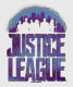 Ce logo de la Ligue de la Justice est accompagné d'une ligne d'horizon de la ville en haut, avec les silhouettes de l'équipe de la Ligue de la Justice découpées du paysage urbain.