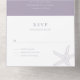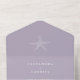 Ce design mariage est un mélange parfait d'élégance et de beachy. La principale caractéristique du design est un petit motif d'étoiles de mer blanc qui se trouve gracieusement au centre de l'arrière - plan couleur lavande violet. Le motif de l'étoile de mer est conçu de façon complexe et ajoute une touche de nature à l'invitation. La typographie utilisée est de couleur blanche classique, ce qui ajoute une touche de sophistication et garantit que le texte est facile à lire. Le style de police utilisé est propre et moderne, créant un look intemporel qui ne sortira jamais de la mode.