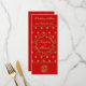 Ces menus faits sur commande de mariage comportent un arrière - plan rouge profond et majestueux avec le motif floral de couleur d'or, un cadre décoratif pour accentuer les noms des jeunes mariés, et un petit chiffre Ganesha. Coordonne avec la chaîne inspirée vraiment uniquement indienne de mariage et de papeterie.
