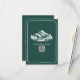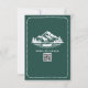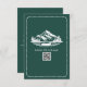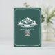Mariage RSVP avec montagnes et illustration à feuillage persistant et canoë avec bordure à pétoncles. L'Arrière - plan est émeraude. Personnalisez le texte et le code QR.