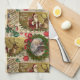 This design features a repeating Christmas pattern that looks like old-fashioned wrapping paper. It displays classic pictures of Santa Claus in his red suit standing next to a reindeer, along with large green holly wreaths tied with red ribbons that circle a snowy winter scene. The design is filled with traditional holiday details like lit candles, scrolls with greetings like "A Happy Christmas Tide," and warm colors that create a cozy and festive feeling.