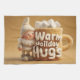 A charming and sweet 3D render or miniature photograph featuring an adorable, fluffy beige felt gnome standing next to a large, textured fabric mug. The gnome has a large white beard, pink cheeks, and a beige knitted hat. The oversized mug is labeled with the message "Warm Holiday Hugs" in white, marshmallow-like letters, and is overflowing with soft white marshmallows. The scene is set against a warm, soft ochre background, emphasizing the cozy, comforting, and whimsical nature of the image.