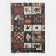 Cette serviette de cuisine présente une esthétique de mosaïque d'art populaire, disposée dans une grille de blocs carrés qui mêlent les éléments appliqués et piqués. Les motifs d'Appliquéd comprennent un citrouille orange audacieux, une corneille noire, des coeurs rouges, des poulets et des fleurs stylisées, tandis que les blocs de pièces présentent des motifs de courtepointe géométriques traditionnels tels que des étoiles, des diamants et des croix. L'utilisation de rouge profond, de crèmes et de blues/noirs foncés, accentués de tissus à motifs comme les pois, les fleurs et les solides texturés, crée un style chaleureux et rustique. Parfait pour la décoration de la ferme, la vie de campagne, l'artisanat primitif et les courtepointes de saison, ce design incarne le charme de la courtepointe traditionnelle avec une atmosphère douillette et artisanale.
