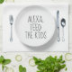 Humorous command for the Alexa device to feed kids on a white dinner plate, isolated against a white background. The text on the plate is editable, and the background color can be changed.