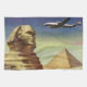 Illustration vintage de voyage et de transport représentant des personnes voyageant en avion et à dos de chameau près du célèbre monument africain Sphinx et des pyramides dans le désert en Égypte, en Afrique. Le Grand Sphinx de Gizeh est une statue de calcaire représentant une créature mythique au corps de lion et à tête humaine) qui se dresse sur le plateau de Gizeh sur la rive ouest du Nil.