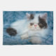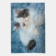 Cette jolie photo Getty Images présente un chaton blanc et noir moelleux assis sur une couverture bleue.
