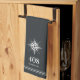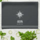 Une serviette de cuisine simple et élégante sur mesure portant le numéro de votre maison et le nom de votre rue en lettres blanches sous une illustration de boussole nautique. Fait un grand cadeau de clôture de courtier, cadeau de chauffage au foyer, ou une touche de finition unique pour votre maison de location de vacances ou maison de plage.