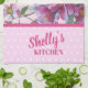 These beautiful kitchen towels have a pattern of apple blossoms in the center and pink with white polka dots on the top and bottom. A dark pink fuschia faux ribbon separates the sections. The ties are also dark pink to match. At the bottom you personalize it with the person's name. There are also pot holders and oven mitts and aprons to match, as well as other items.