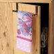 These beautiful kitchen towels have a pattern of apple blossoms in the center and pink with white polka dots on the top and bottom. A dark pink fuschia faux ribbon separates the sections. There are also pot holders and oven mitts and aprons to match, as well as other items.