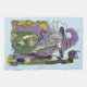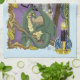 Un sorcier tout en violet tenant un bâton qui a une boule de cristal violet. Un petit dragon vert, un noeud celtique, une bougie et une bordure d'automne feuilles le tout dans un décor bleu clair