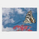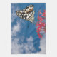 Photo de fond d'un papillon coloré se nourrissant d'une fleur contre un arrière - plan bleu ciel.