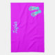Présenté ici est une serviette de cuisine avec un arrière - plan de couleur fuchsia avec votre nom écrit en bleu cursive police. Au coin inférieur droit se trouve une paire de tongs bleu vif. Dramatique et accrocheur, commandez votre serviette de cuisine dès aujourd'hui !
