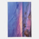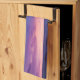 Une serviette de cuisine avec une belle photo aux couleurs frappantes de violet, bleu et rose au coucher du soleil. Un joli littoral parsemé de rochers.