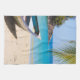 Serviette de cuisine avec une scène de plage tropicale idyllique. Eau cristalline bleu turquoise et plage de sable brun doux. Des feuilles de palmiers accrochés au-dessus. Un vieux bateau à rames en bois est installé sur la plage. Un paysage serein et paisible.