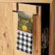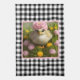 Jolie serviette de cuisine avec un tableau d'art numérique d'un bébé poussin au milieu de fleurs roses et jaunes avec noir et blanc en vichy chèque arrière - plan frontière.