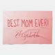 Idéal pour la Fête des Mères, l'anniversaire de maman, ou les fêtes, ce design présente un arrière - plan rose et sombre. "Best Mom Ever" est affiché en police rouge vif. Un modèle pour insérer un nom dans une belle police cursive se trouve juste en dessous. Commandez votre serviette de cuisine dès aujourd'hui !