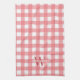 Serviette de cuisine rose en vichy avec votre initiale en rouge pâle et nom de famille en blanc.
