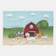 L'illustration originale de Destei d'un mignon manteau anglais couleur crème Golden Retriever race dog dans une ferme. Il y a une grange rouge derrière le chien avec du foin sur le côté de l'entrée. Il y a aussi deux poulets à proximité du chien, une vache noire et blanche derrière une clôture et un mouton mignon près d'un arbre. L'arrière - plan présente des collines verdoyantes et un ciel bleu avec des nuages.