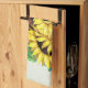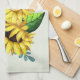 Torchon de cuisine avec un joli bouquet de fleurs - tournesols jaunes joyeux et feuilles vertes. Frais et amusant.