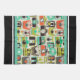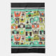 Serviette de cuisine de 16" x 24" avec une image de caméras rétro colorées sur le beige. Bordures de rayures noires, aqua et blanches. Voir serviettes assorties, serviettes en papier, set de table en tissu, set de table en papier et dessous de verre. Voir toute la collection de serviettes de cuisine Nifty les années 50 dans le FOOD/BEV| Section Linens.
