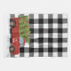 Camion rouge rétro avec flocons de neige, nom de famille, et arbre de Noël vert sur plaid de buffle blanc et noir.