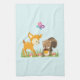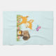 Serviette de cuisine avec une jolie illustration représentant un cerf de bébé et un petit écureuil tenant une glande et un papillon volant au-dessus de leur tête. Ces adorables créatures boisées se tiennent debout sur une herbe avec quelques champignons fantaisistes à leurs pieds. Arrière - plan bleu clair.
