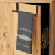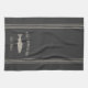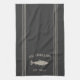 Customisez votre cuisine avec cette serviette personnalisée mignonne portant votre nom de famille ou votre nom de maison et l'année établie en lettrage bronzé doux accentué avec une illustration de poisson sur un arrière - plan gris charbon.