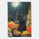 Un chat noir est assis dans une porte avec des citrouilles, une lanterne, un balai, des feuilles d'automne et une pleine lune de récolte derrière.