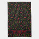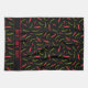Serviette de cuisine noire imprimée partout avec des piments rouges et verts, avec une bande noire sur le fond avec les mots HOT HOT HOT HOT. Le texte est personnalisable pour que vous puissiez le modifier en votre nom ou en votre message