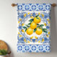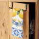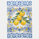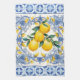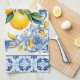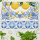Serviettes de cuisine bouquet de carreaux et citrons méditerranéens. De beaux citrons sur un fond de carreaux méditerranéens bleu et blanc. Vous pouvez ajouter du texte pour personnaliser.