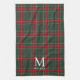 Personalized kitchen towel for the holiday season featuring classic style forest green and red Christmas plaid pattern with custom initial and name.