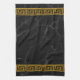 Serviette de cuisine noire de 16" x 24" avec image de marbre noir et bordures de clés grecques noires et métalliques d'or. Voir serviettes assorties, serviettes en papier, set de table en tissu, set de table en papier et dessous de verre. Voir toute la collection Toga Kitchen Towel dans la rubrique FOOD/BEV| Section Linens.