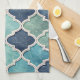 A seamless geometric pattern kitchen towel inspired by classic Mediterranean and Moroccan tilework. This design features elegant quatrefoil shapes in rich shades of cobalt blue, teal, and aqua, accented with light cream outlines and subtle marbled textures. The combination of deep ocean hues and cracked-stone details creates a timeless yet modern aesthetic. Perfect for those who love artistic geometry, coastal tones, and refined tile-inspired artistry that evokes both tradition and contemporary design.