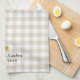 Cuisine de style rustique et moderne sur mesure, serviette de cuisine design avec nom sur motif de buffle beige.
