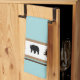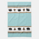 Cette serviette de cuisine est présentée dans un joli imprimé de style lodge d'ours et d'icônes de sapin en silhouettes noires et chocolat sur rayures blanches et brunes tan et serviette à rayures couleur aqua et chocolat. Customisez cet objet ou achetez tel quel.