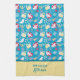 Cette mignonne serviette de cuisine est décorée d'un adorable motif de style rétro avec des oiseaux blancs chatoyants, des fleurs jaunes, des coeurs rouges et des tasses jaunes sucrées contre un arrière - plan bleu vif. Personnalisez avec votre nom. Fait le cadeau parfait pour votre femme, maman, ou grand-mère pour la fête des mères.
