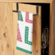 Une mignonne serviette de cuisine de vacances moderne et fantaisie avec les mots FA LA LA dans un style dessiné à la main. Les As sont représentés par des arbres de Noël.