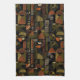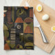 Sophisticated mid-century geometric pattern kitchen towel featuring layered circles, arches, triangles, and rectangles in forest green, burnt orange, ochre, and cream on a black background. Rich textures and retro-modern shapes create a bold design ideal for Bauhaus lovers, vintage décor fans, and anyone drawn to moody modern style.