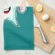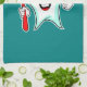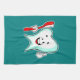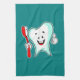 Serviette de cuisine avec l'illustration d'une grande dent blanche de style dessin animé souriant joyeusement en tenant une brosse à dents rouge et en donnant le signe pouce vers le haut.